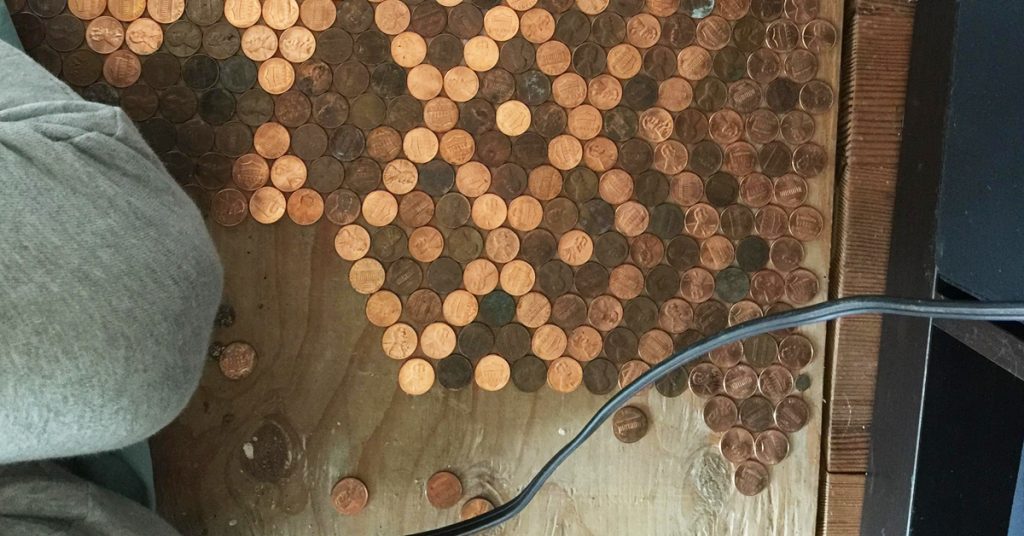 Det ser nesten litt sprøtt ut: Hun limer faktisk mynter til gulvet.