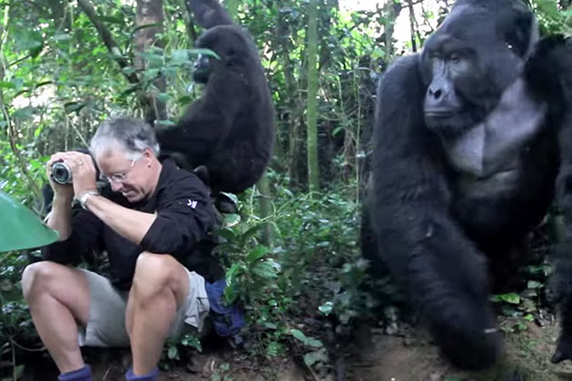 Disse to turistene ble nylig utsatt for samme situasjon i Uganda. Fremfor å løpe avgårde ble de stående helt stille for å signalisere at de ikke var noen trussel for gorillaene.
